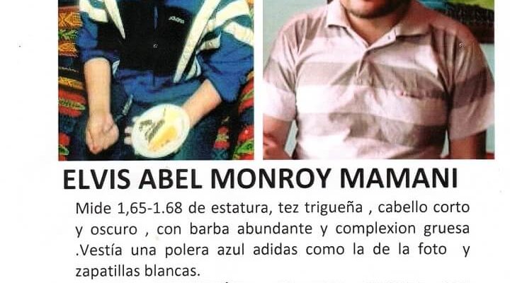 El sujeto desaparecido es de cualidades especiales, responde al nombre de Elvis Abel Monroy mamani,  y esta desaparecido desde el 15 de enero, la familia se encuentra muy preocupada y pide a la colectividad moqueguana, remitir cualquier informacion que pueda dar con su paradero a través de la policía nacional.